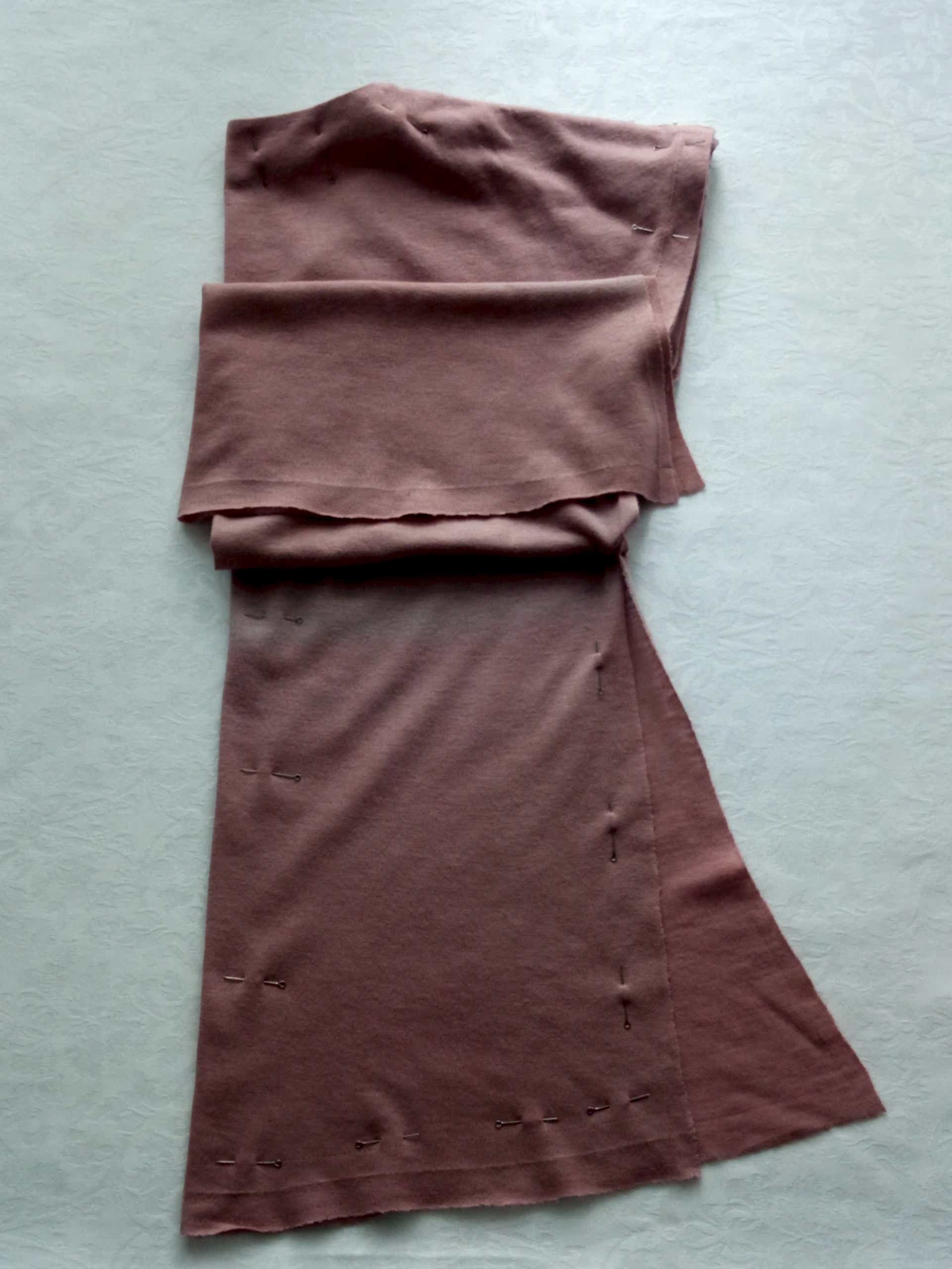 Обратите внимание, полочку нужно сложить пополам так, как она ложится. Pin-Up ориентиром для вас будет заколотая горловина и пройма. Боковые швы при этом могут не совпасть, как в данном случае.